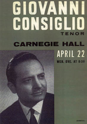 "Giovanni Consiglio...gave an impression of a distinctly Italian lyricism natural and uninhibited; and well focused, while his outspoken top notes combined vigor with ringing brightness... showed a command his upper notes and the darker, warmer hue of his lower tones gave his singing due contrast."