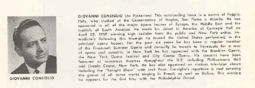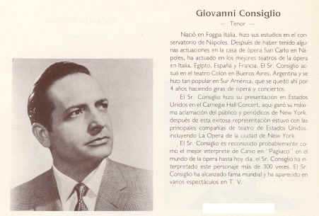 "Giovanni Consiglio - Tenor - Nació en Foggia, Italia, hizo sus estudios en el Conservatorio de Nápoles. Después de haber tenido algunas actuaciones en la casa de ópera San Carlo en Nápoles, ha actuado en los mejores teatros de la ópera en Italia, Egipto, España y Francia. El Sr.Consiglio actuó en el teatro Colón en Buenos Aires, Argentina y se hizo tan popular en Sur América que se cuedó ahí por 4 años haciendo giras de ópera y conciertos. El Sr. Consiglio hizo su presentación en Estados Unidos en el Carnegie Hall Concert, aquí ganó su máxima aclamación del público y periódicos de New York, después de esta exitosa representación estuvo con las principales compañias de teatro de Estados Unidos, incluyendo La Opera de la ciudad de New York. El Sr. Consiglio es reconocido probablemente como el mejor interprete de Canio en "Pagliacci" en el mundo de la ópera hasta hoy día. El Sr. Consiglio ha interpretado este personaje más de 300 veces. El Sr. Consiglio ha alcanzado fama mundial y ha aparecido en varios espectáculos en T.V."